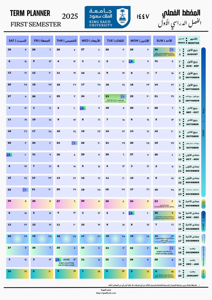 مخطط فصلي أسبوعي (تقويم) لجامعة الملك سعود للفصل الدراسي الأول 1447-2025