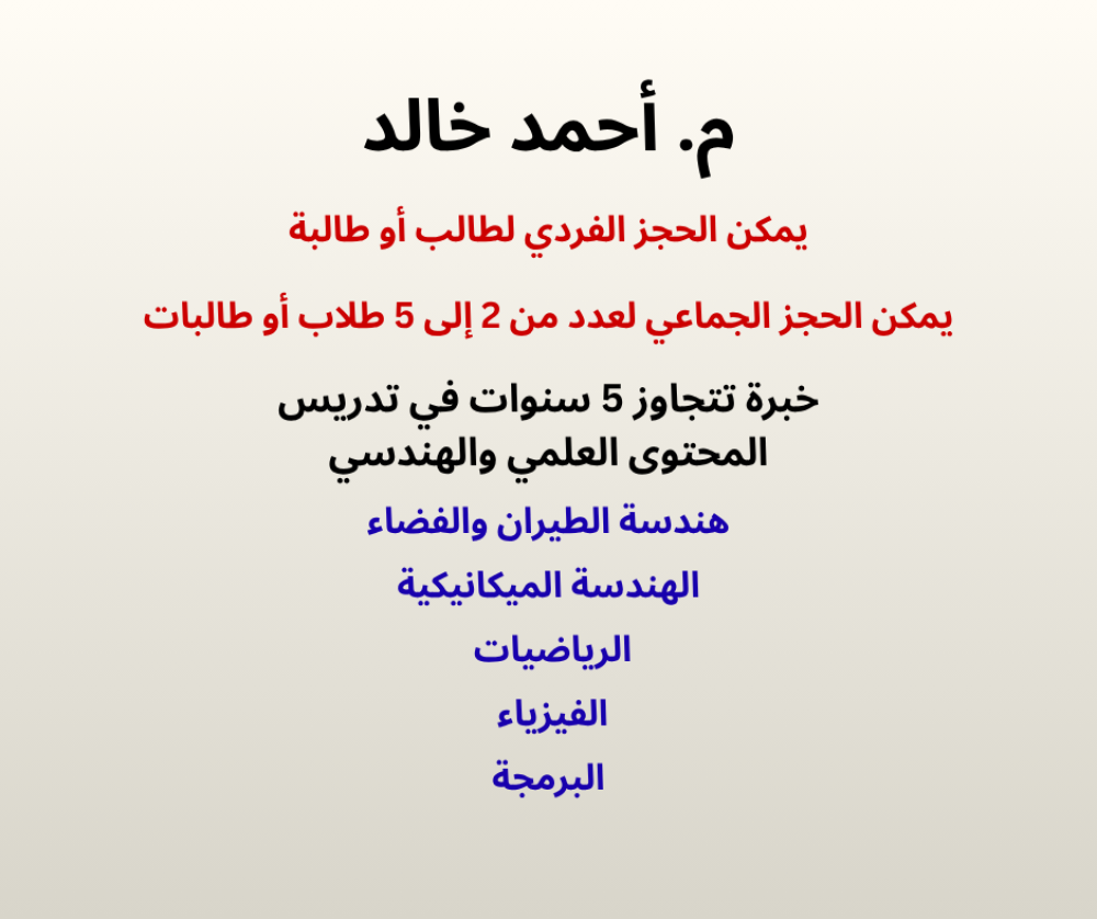 مهندس طيران وفضاء بخبرة تتجاوز 5 سنوات في تدريس المحتوى العلمي والهندسي. متخصص في مواد الطيران (الدفع، التحكم، الهياكل، والديناميكا الهوائية)، إلى جانب الرياضيات وأسس البرمجة، وكذلك بعض فروع الهندسة الميكانيكية. يجمع بين المعرفة الأكاديمية العميقة والخبرة العملية ليقدّم للطلاب والطالبات أسلوب شرح مبسط ومباشر يساعدهم على الفهم السريع وبناء أساس علمي قوي.